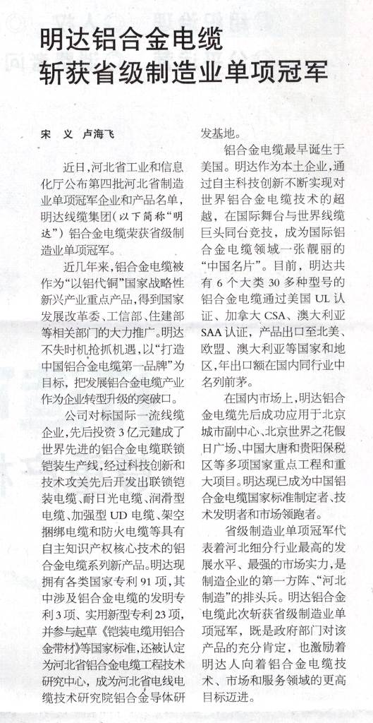 近日,河北省工業(yè)和信息化廳公布第四批河北省制造業(yè)單項冠軍企業(yè)和產(chǎn)品名單,明達(dá)線纜集團(tuán)(以下簡稱“明達(dá)”)鋁合金電纜榮獲省級制造業(yè)單項冠軍。
